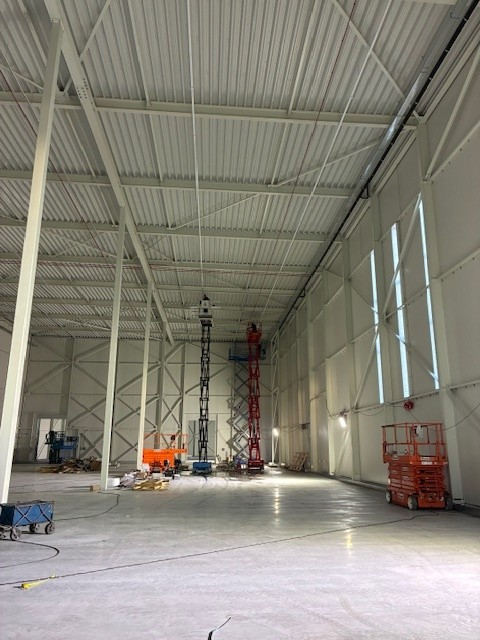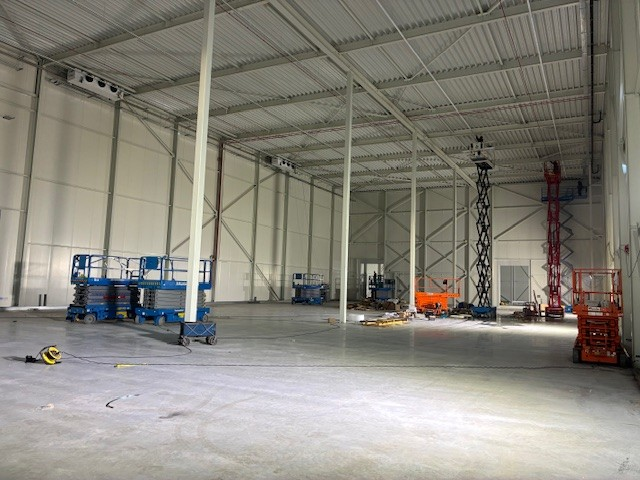 Bij ons bouwproject voor Bieze Food Group in Nijkerk is opnieuw een mooie stap gezet. De betonvloer is inmiddels voldoende uitgehard, waardoor de installateurs met hoogwerkers aan de slag kunnen met het aanbrengen van de installaties.