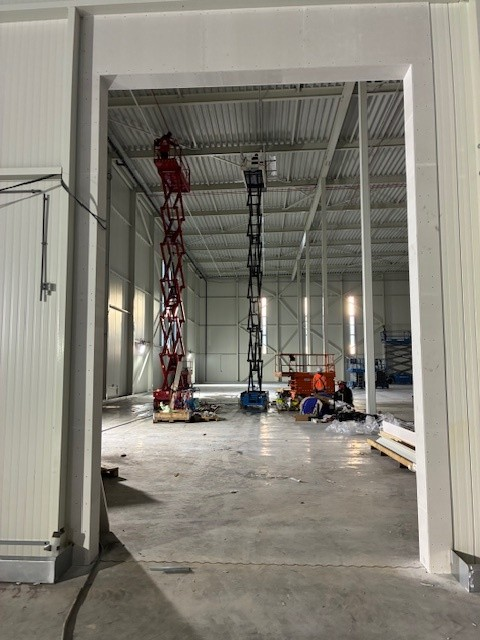 Bij ons bouwproject voor Bieze Food Group in Nijkerk is opnieuw een mooie stap gezet. De betonvloer is inmiddels voldoende uitgehard, waardoor de installateurs met hoogwerkers aan de slag kunnen met het aanbrengen van de installaties.