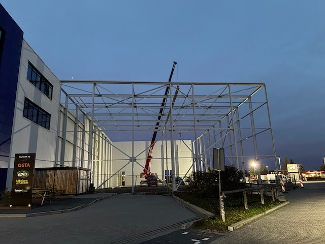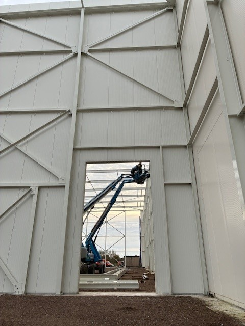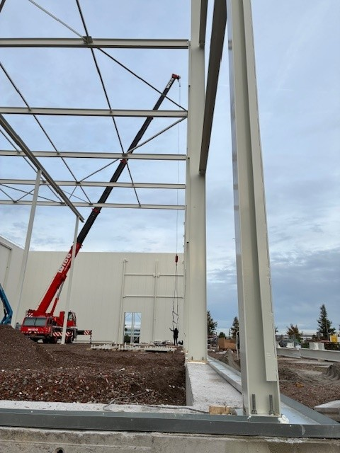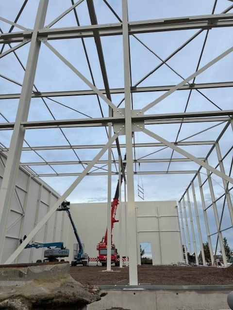 De bouw van het hoogwaardige BREEAM-gecertificeerde pand voor Bieze Food Group in Nijkerk verloopt voorspoedig. De staalconstructie is begin volgende week gereed en inmiddels zijn de werkzaamheden voor het aanbrengen van de geïsoleerde gevelpanelen gestart.