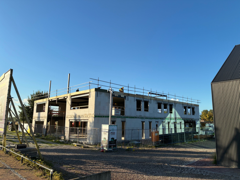 Volgende week gaan we volop aan de slag met het lijmwerk van de kalkzandsteenelementen voor de laatste verdieping. De werkzaamheden vorderen gestaag.