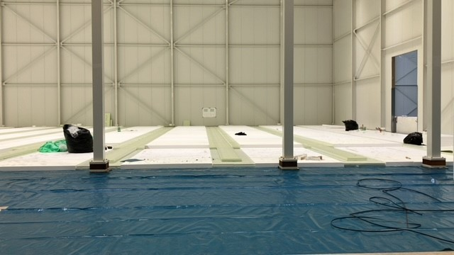 In de vriescel wordt gewerkt aan de vloerisolatie. We maken hier verdiepte stroken voor de onderrails voor verrijdbare stellingen.
